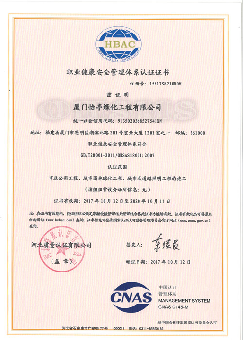 職業(yè)健康安全管理體系認證證書